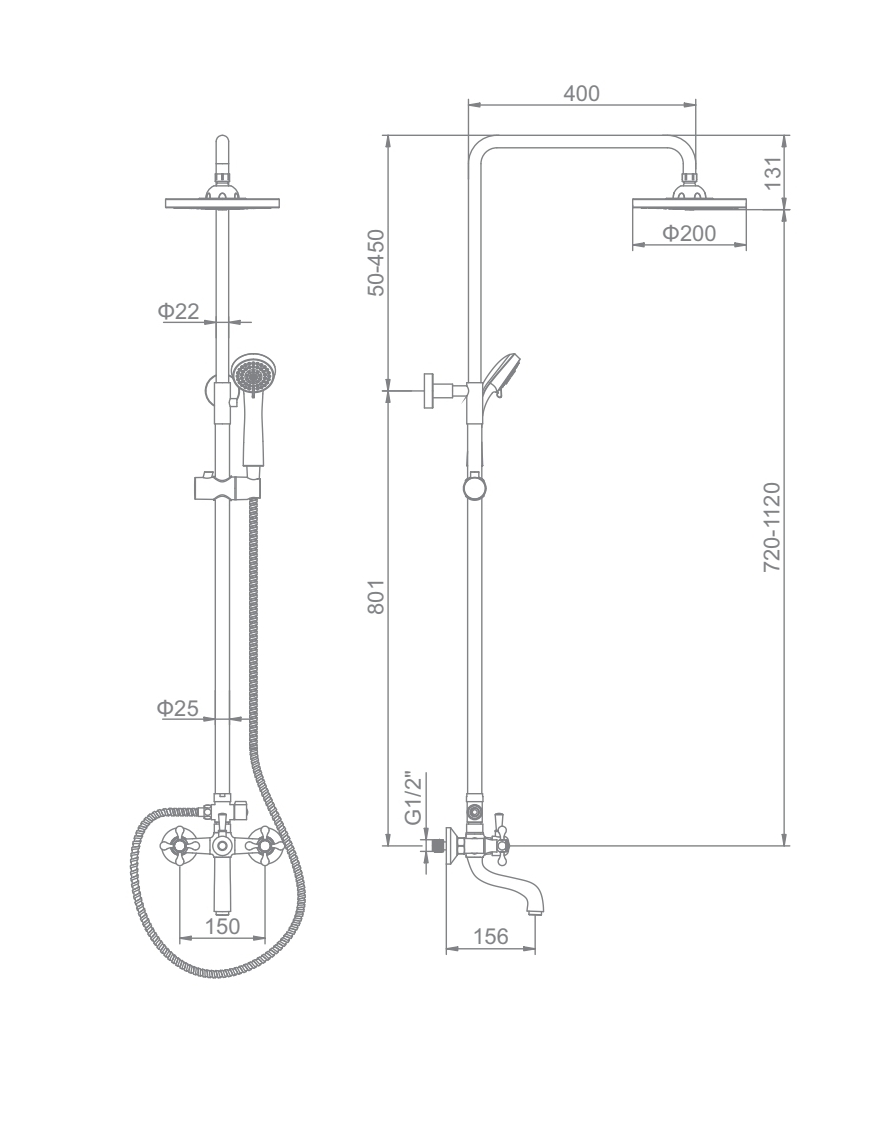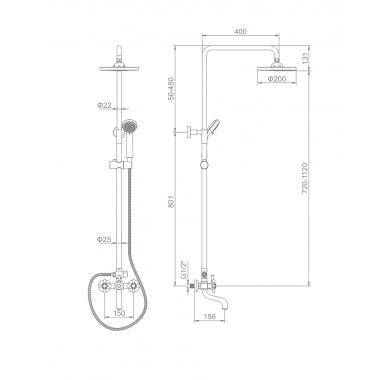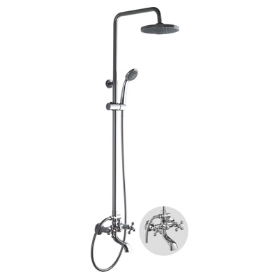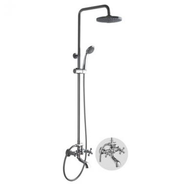 штанга и крепление, смеситель с керам. кран-буксами и фиксированным изливом, лейка д/душа+держатель, лейка "тропическая", шланг